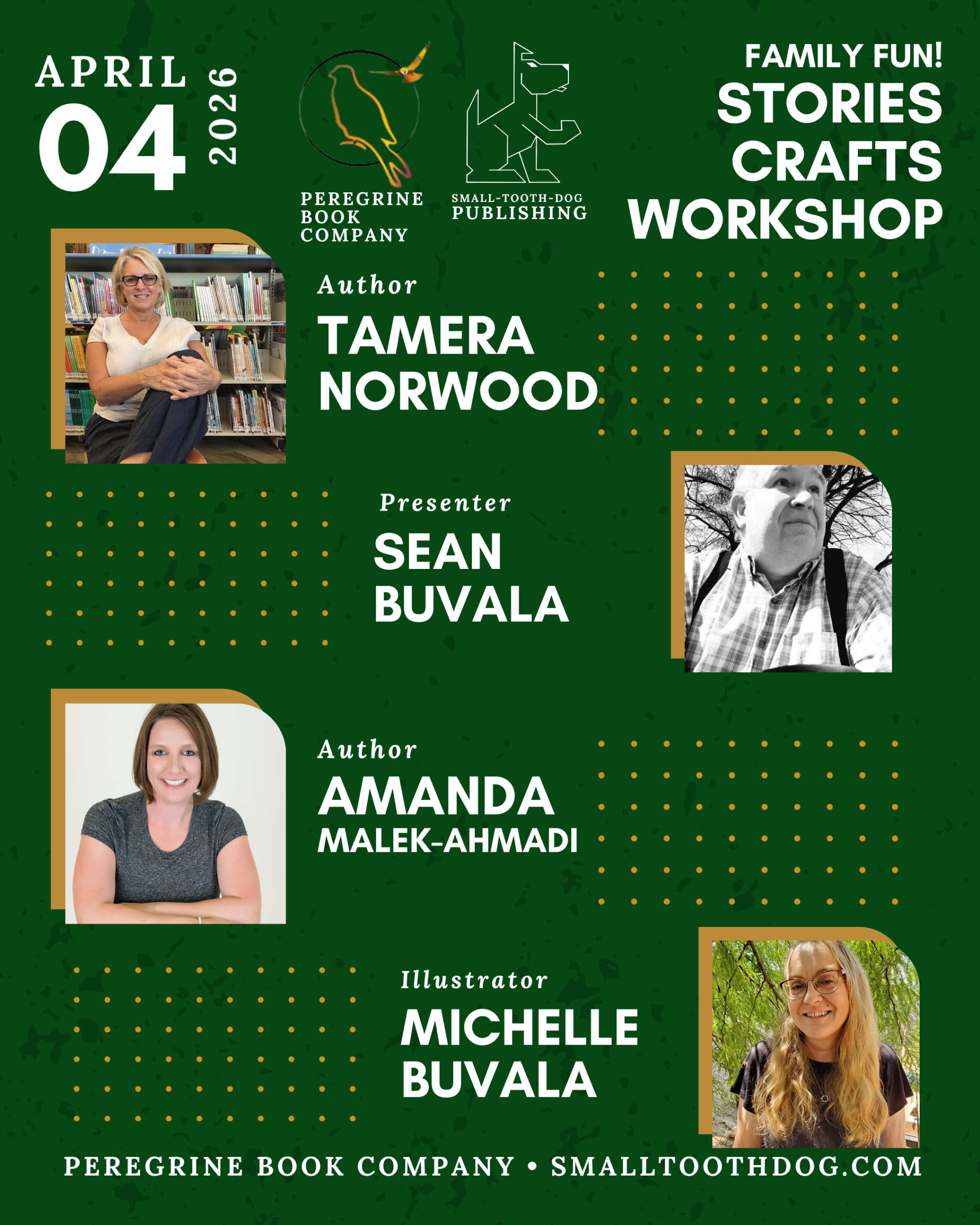 We are heading to Prescott, Arizona. On Saturday, April 4, Small-Tooth-Dog Publishing will be at Peregrine Book Company for a full morning of storytimes, free family crafting activities, and a live publishing workshop. The event runs from 10:30 a.m. to 2:00 p.m. and is free to attend.